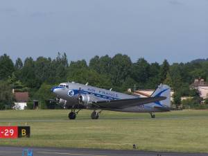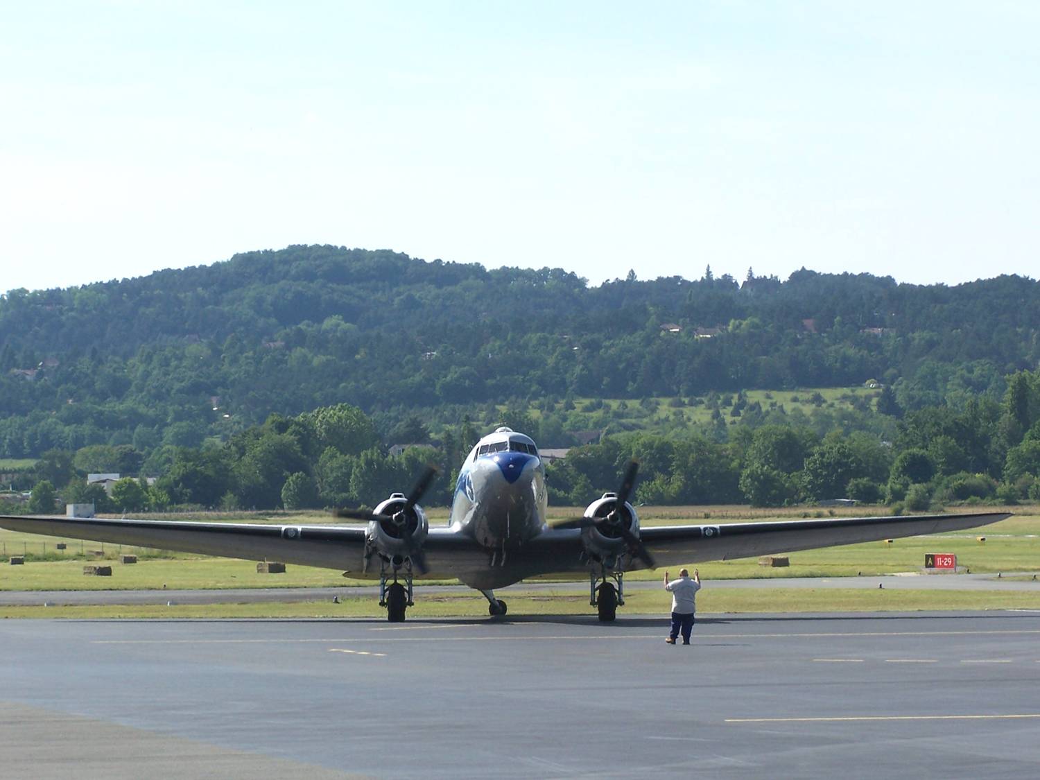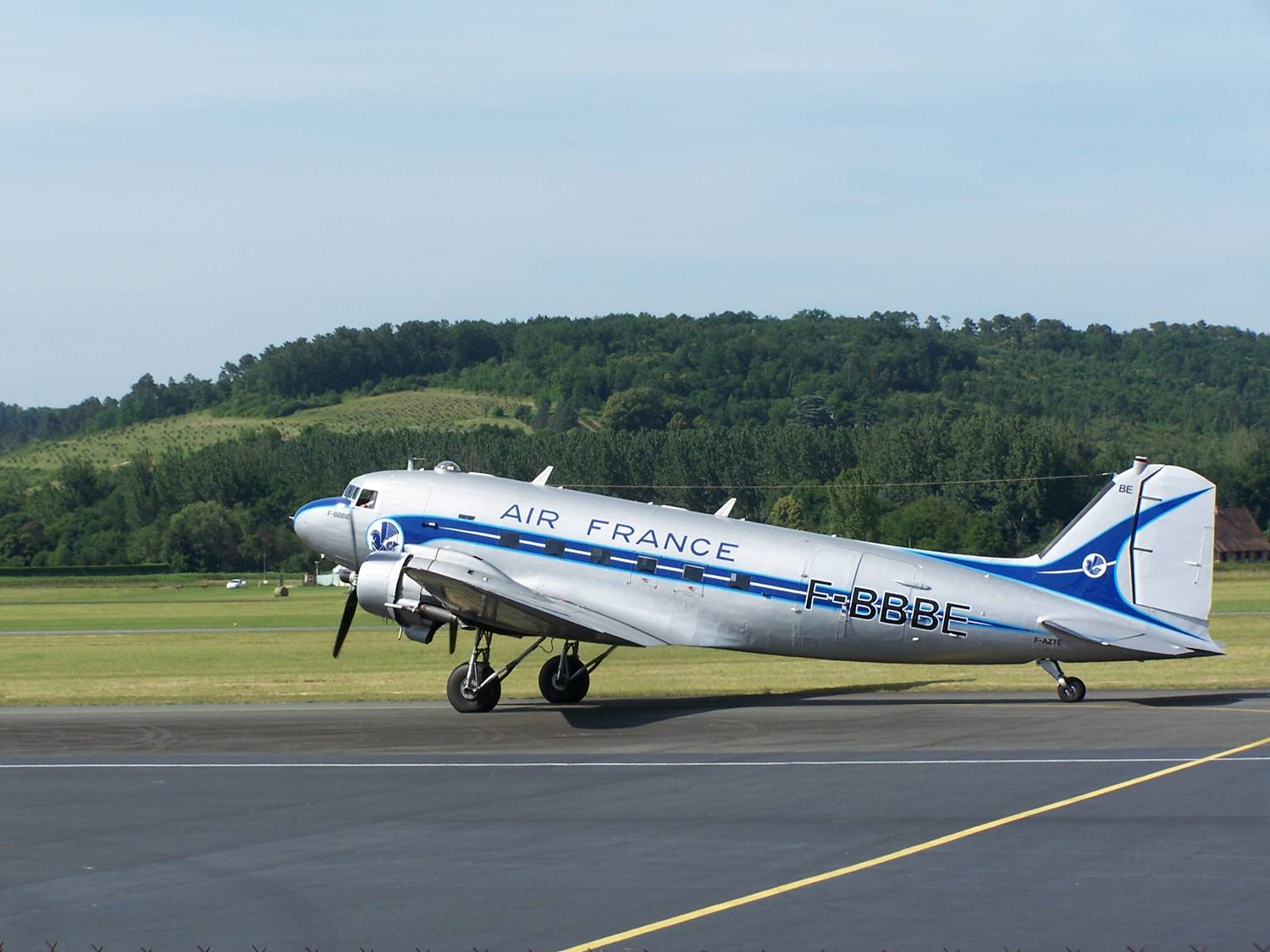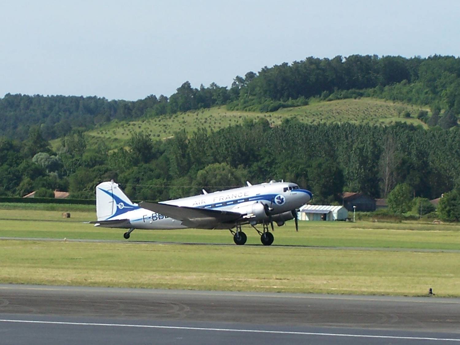 Le DC 3 au couleur d’Air France vient d’arriver sur tarmac de l’aérodrome de Périgueux. Il a fait le déplacement depuis la région parisienne dans le cadre des 10 ans d’ORBIFLY. Il sera visible jusqu’à Mardi, dépéchez vous de venir l’admirer.