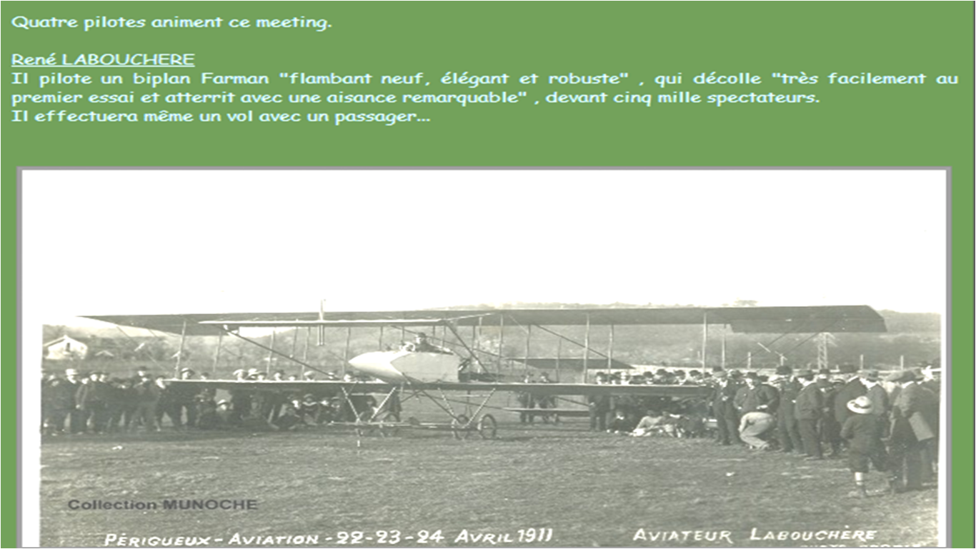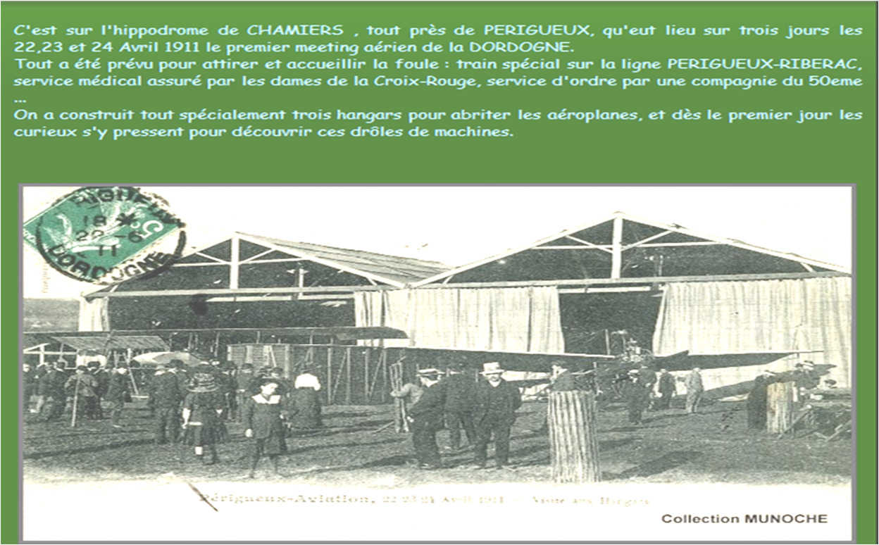 Il y a 100 ans, les 22, 23 et 24 avril 1911 se déroulait sur l’hippodrome de Chamiers à l’ouest de la ville de Périgueux le premier meeting aérien de la Dordogne. Pour fêter ce centenaire l’aéro-club de Périgueux, va organiser, le dimanche 10 juillet sur l’aérodrome de Bassillac, un grande fête de l’air qui regroupera tous les sports aériens d’Aquitaine.