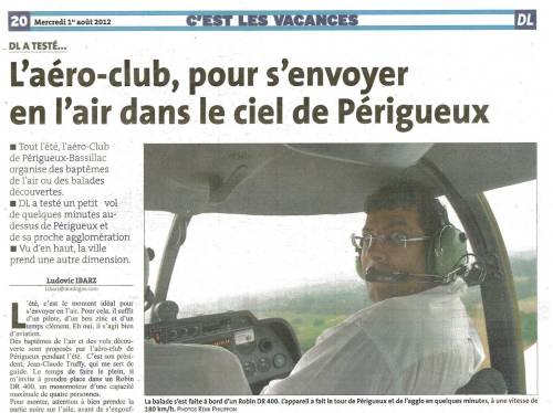 Samedi dernier, malgré des conditions météorologiques moyennes, un journaliste et un photographe du journal la Dorgne Libre ont testé les baptemes de l’air que réalisent l’Aéroclub de Périgueux au cours de ces vacances estivales.