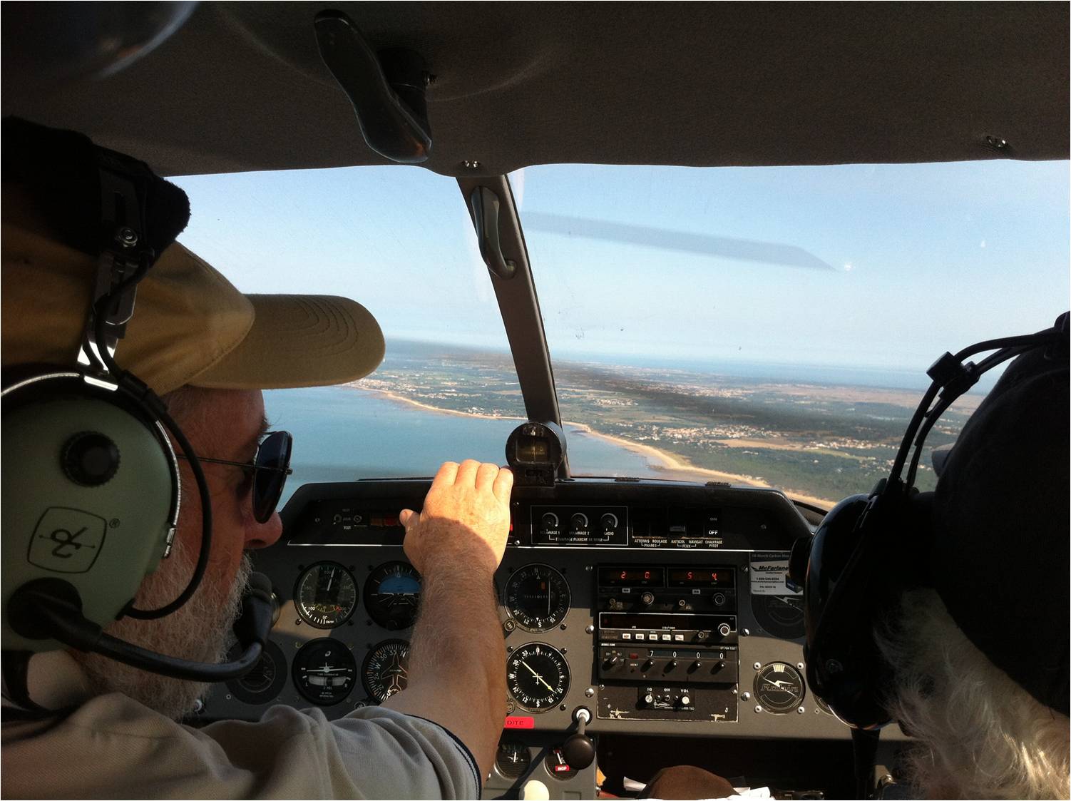 Le matin, un voyage superbe, avec une visibilité parfaite et une luminosité idéale pour notre photographe du jour; Laurent, qui jonglait entre son appareil et le mien. Beaucoup de pilotes avaient profité de cette matinée pour rejoindre également l’aérodrome de Saint-Pierre-d’Oléron. A l’arrivée, il fallait ouvrir les yeux et être attentif aux messages des autres appareils, d’autant qu’autre RV était également dans le circuit (et à contre QFU). Un petit message pour l’avertir de son erreur et nous voilà un peu plus serein pour la finale et l’atterrissage piste 28.