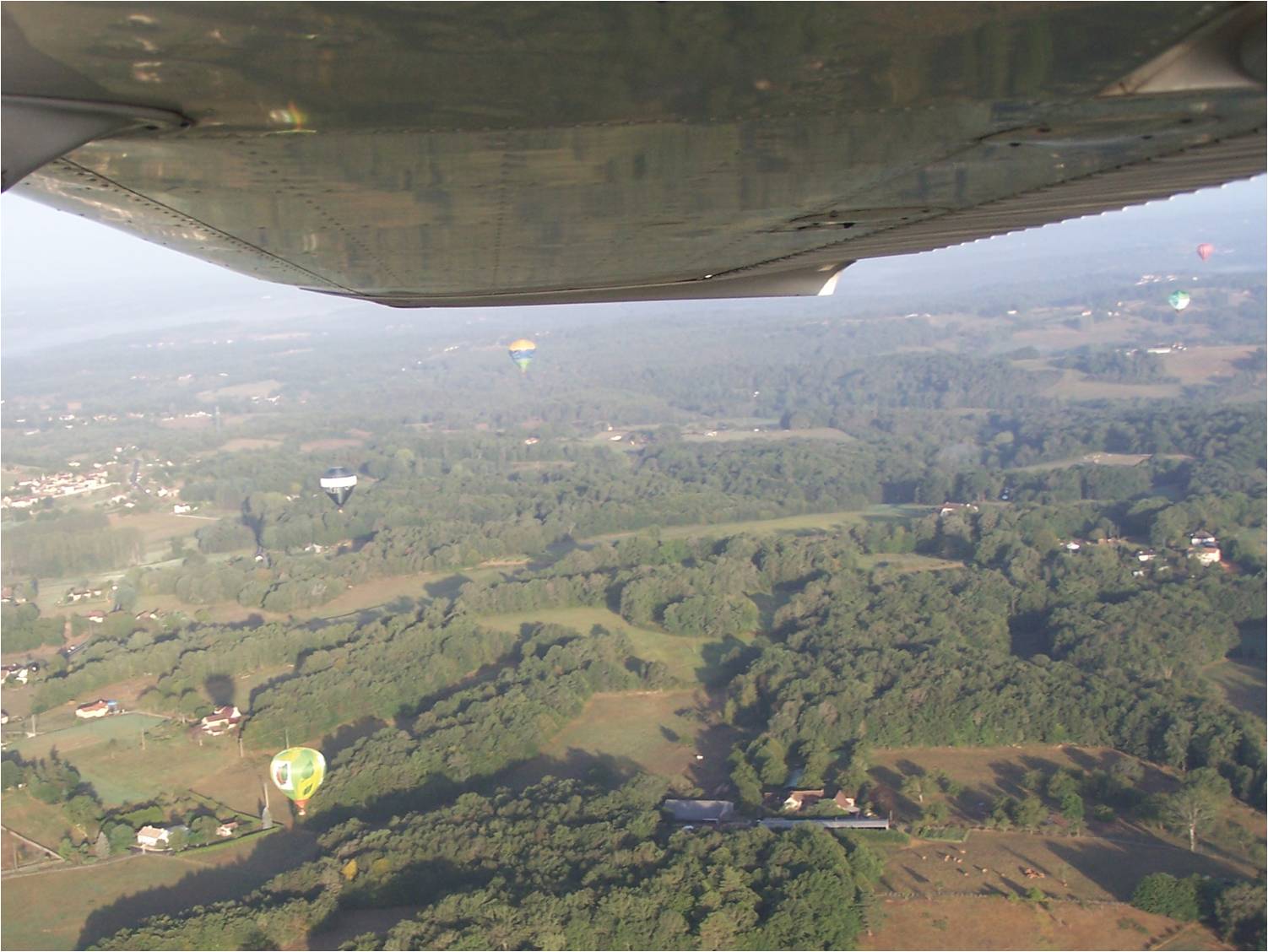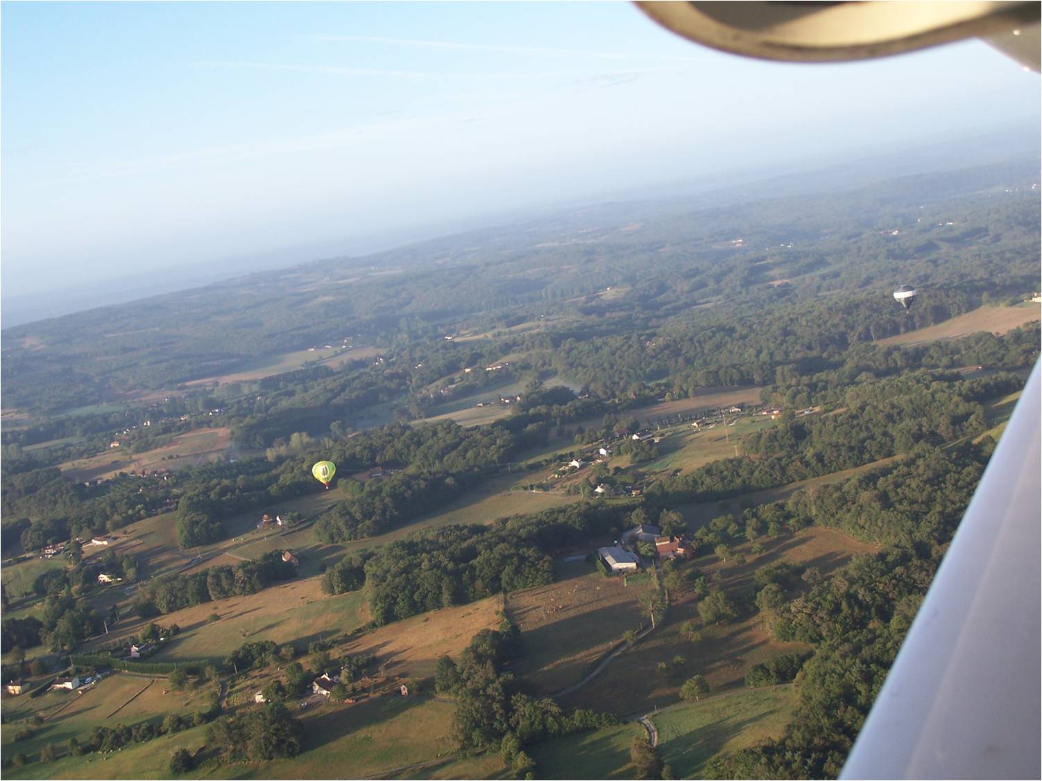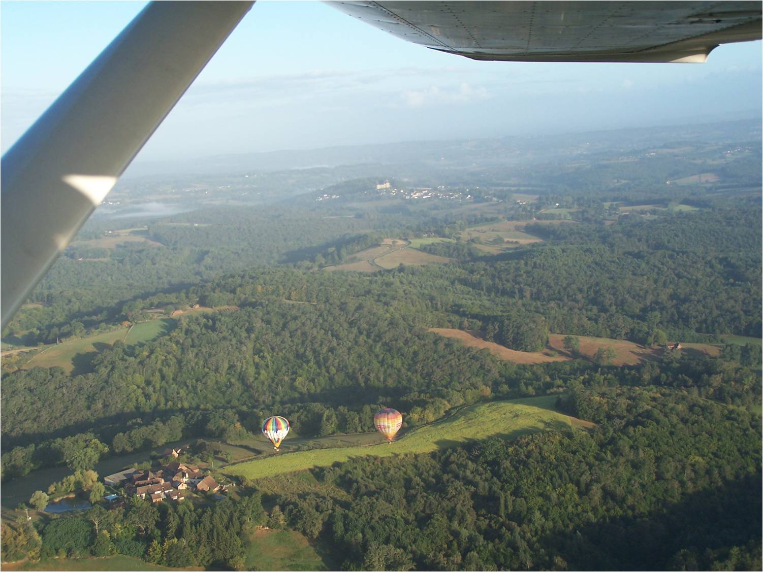 Quel idée farfelue d’aller troubler le vol silencieux des montgolfières en ce dédut de dimanche matin. Il n’y a pas que les pilotes de ces gros ballons à air chaud, qui profitent de l’air calme et refroidi du petit matin. Il y aussi les pilotes de l’aéro-club de Périgueux qui apprécient les brumes du petit matin et les belles couleurs du soleil levant. Quand en plus, ils savent que les montgolfiades de Corgnac sur l’Isle regroupent une dizaine de montgolfières multicolores, alors, ils ne peuvent que sortir le cessna du hangar et aller voler quelques chichés des ces engins et des paysages de notre Périgord.
