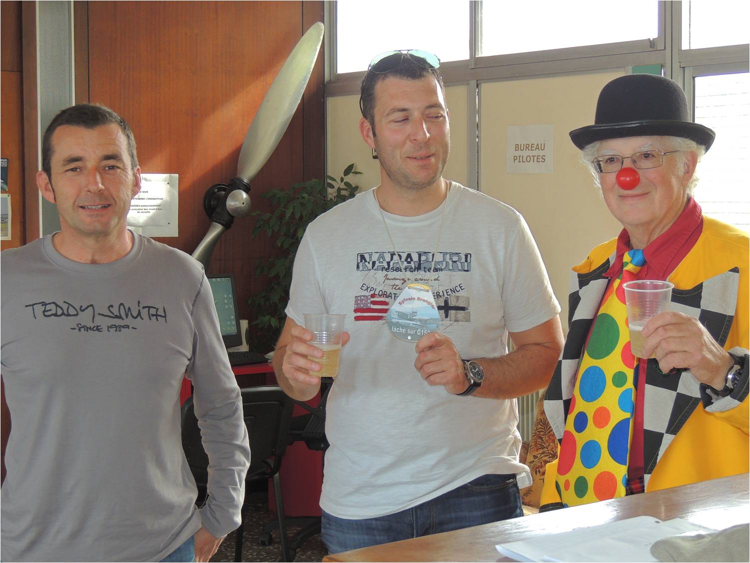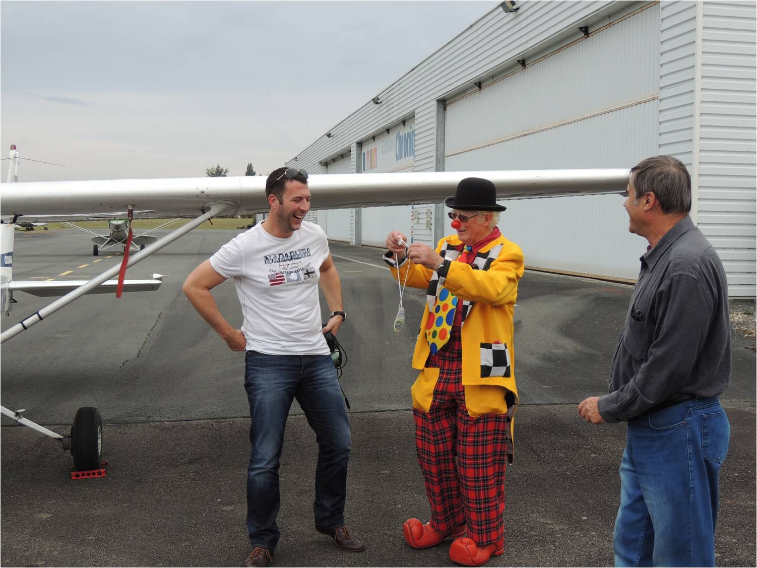 Le clown de l’aero-club de Périgueux attendait le lacher de Sylvain, depuis déjà, quelques vols. Malheurement le week-end dernier, le jour, du vrai lacher de Sylvain, il était en Bretagne. Mais aujourd’hui au retour de son vol avec Jean-François sur le cessna 152, Sylvain a eu l’agréable surprise, de découvrir ce que Bernard alia » le clown » lui avait concocté. Le pilotage est une activité trés rigoureuse, mais voici un exemple, où, les pilotes peuvent également ne pas se prendre au sérieux.