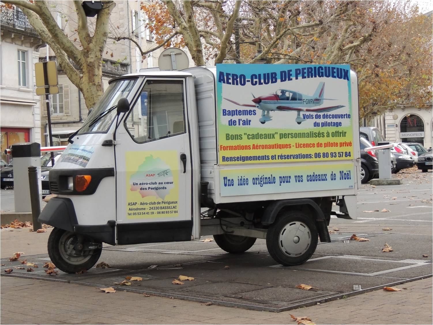 L’aeroclub se déplace dans les rues de Périgueux avec un véhicule original. Ce n’est pas un avion que les passants vont croiser mais un triporteur façon italienne. Il a une similitude avec un avion, il a 3 roues. Une idée originale pour faire connaître aux périgourdins l’aéro-club et toutes ses activités du simple baptême de l’air pour découvrir le Périgord, aux formations qui y sont dispensées, comme la Licence de Pilote Privé (PPL). Visitez le site WEB de l’aeroclub de Périgueux ou venez directement à la rencontre des pilotes de l’association sur l’aérodrome de Bassillac. Ils vous détailleront tous les formations aéronautiques et vous feront découvrir nos avions. Ils vous expliqueront le fonctionnement des instruments que l’on trouve sur la planche de bord, comme le badin (indicateur de vitesse), l’altimètre, le variomètre, l’horizon artificiel, le GPS (comme pour la voiture),…