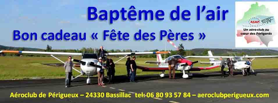 Fête des Pères à l’aéroclub de Périgueux- les bons cadeaux pour un baptême de l’air d’une durée minimale de 30 minutes sont à votre disposition: exemple le vol pour deux personnes sont au prix de 82€00. N’hésitez pas à venir retirer votre bon de vol à l’aéroclub ou à réserver votre avion au 06 80 93 57 84.