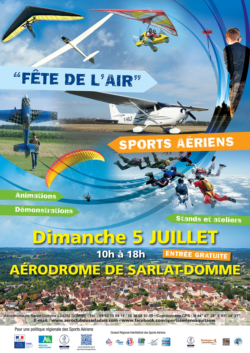Les comités aquitains des sports aériens et l’Aéroclub du Sarladais vous accueillent à la 8e « FETE DE L’AIR » le dimanche 5 juillet 2015 de 10h à 18h sur l’Aérodrome de Sarlat-Domme.