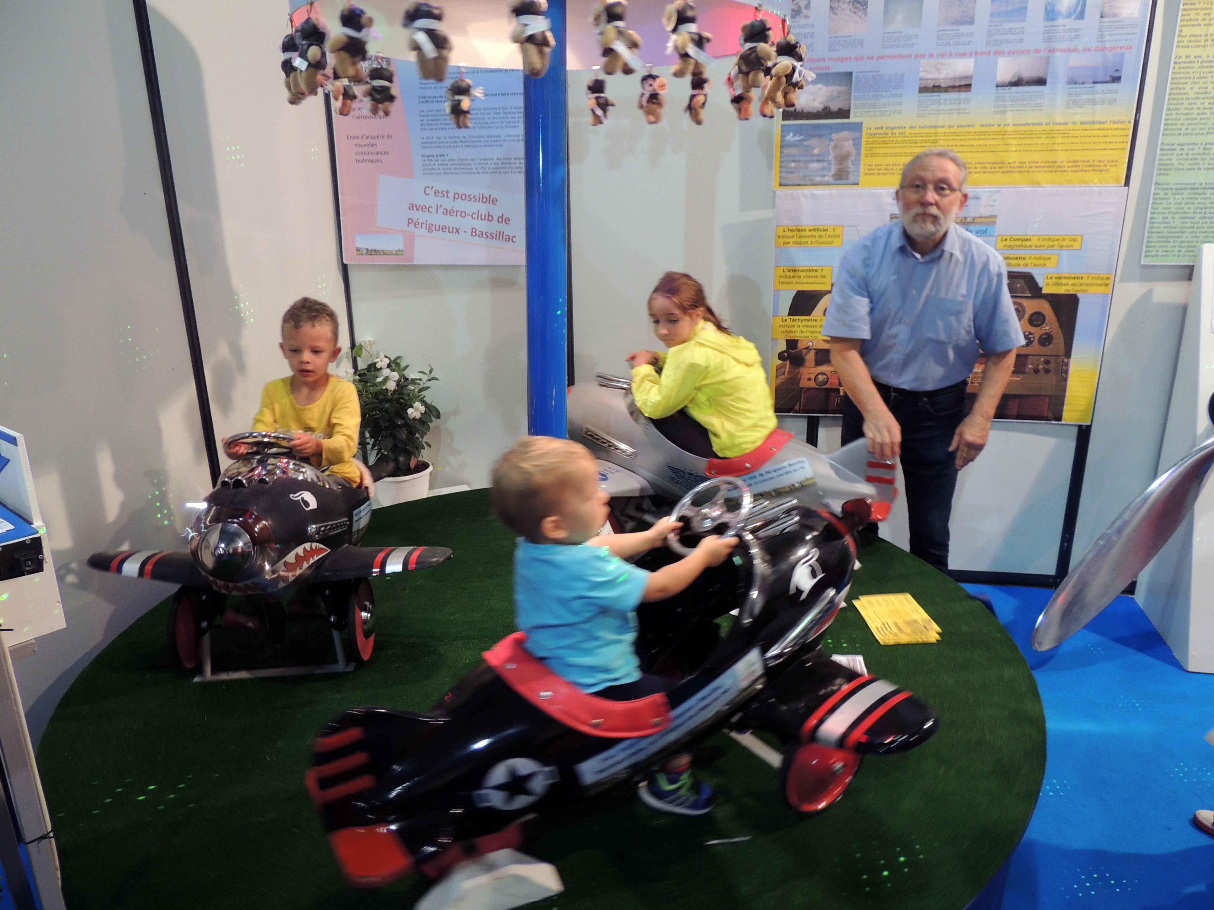17 heures, grosse averse de pluie sur la foire, rien de tel pour que tout le public se précipite à l’intérieur, et parcourt les allées du Hall Montaigne. Sur le stand c’est le manège (dit manège écolo mut avec l’énergie humaine) qui est pris d’assaut et ainsi les visiteurs ont le temps de participer au jeu concours pour gagner des baptêmes de l’air.