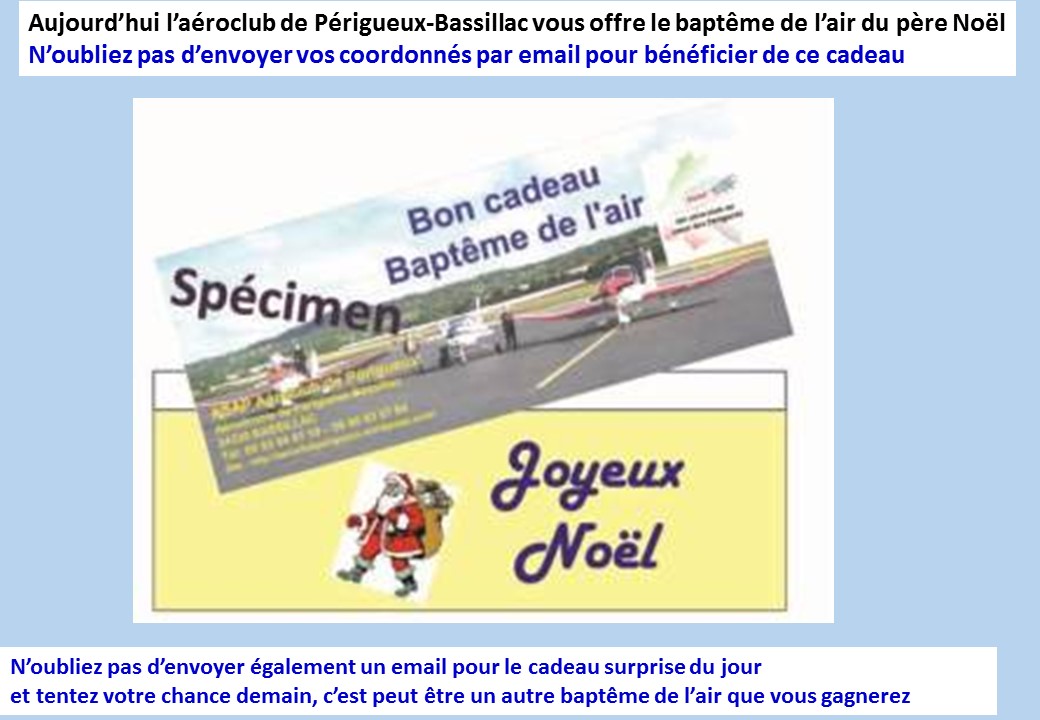 Gagnez votre baptême de l’air pour deux personnes et pleins d’autres cadeaux avec le calendrier de l’avent de l’aéroclub de Périgueux-Bassillac. Tentez votre chance chaque jour en découvrant le cadeau qui cache derrière la date du jour. Un cadeau surprise sera attribué chaque jour par tirage au sort à l’un des participants.