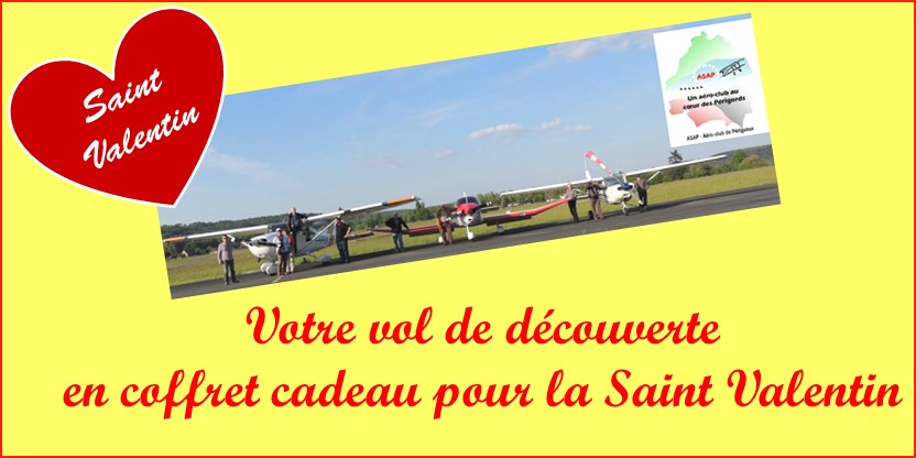C’est bientôt la Saint Valentin, l’aéroclub de Périgueux-Bassillac vous propose une idée de cadeau original; par exemple: le vol de découverte du pilotage à bord de notre avion école. Ainsi vous vous installez en place pilote à bord du cessna 152 bi-place et notre instructeur vous montre le b. a ba du pilotage.