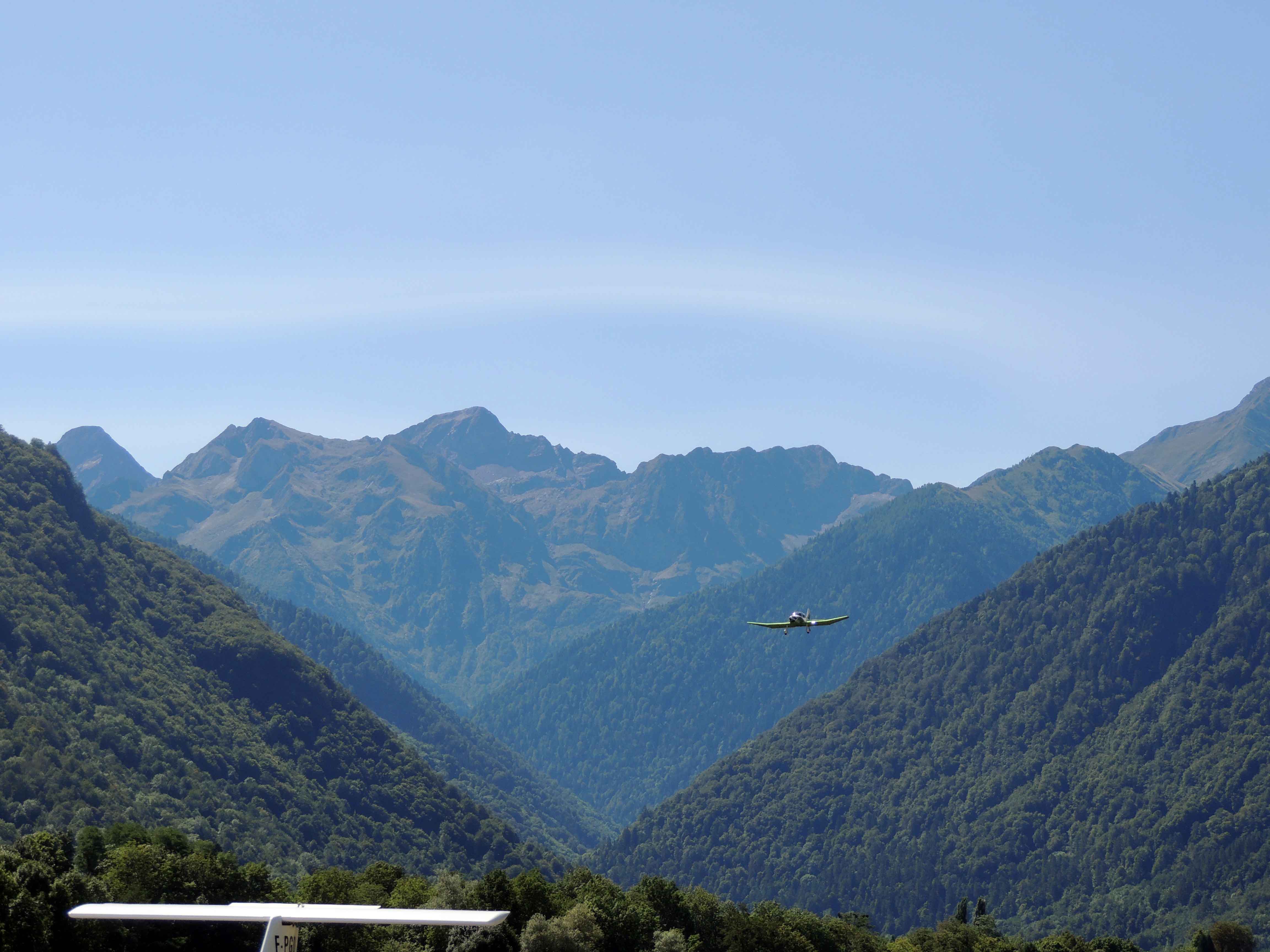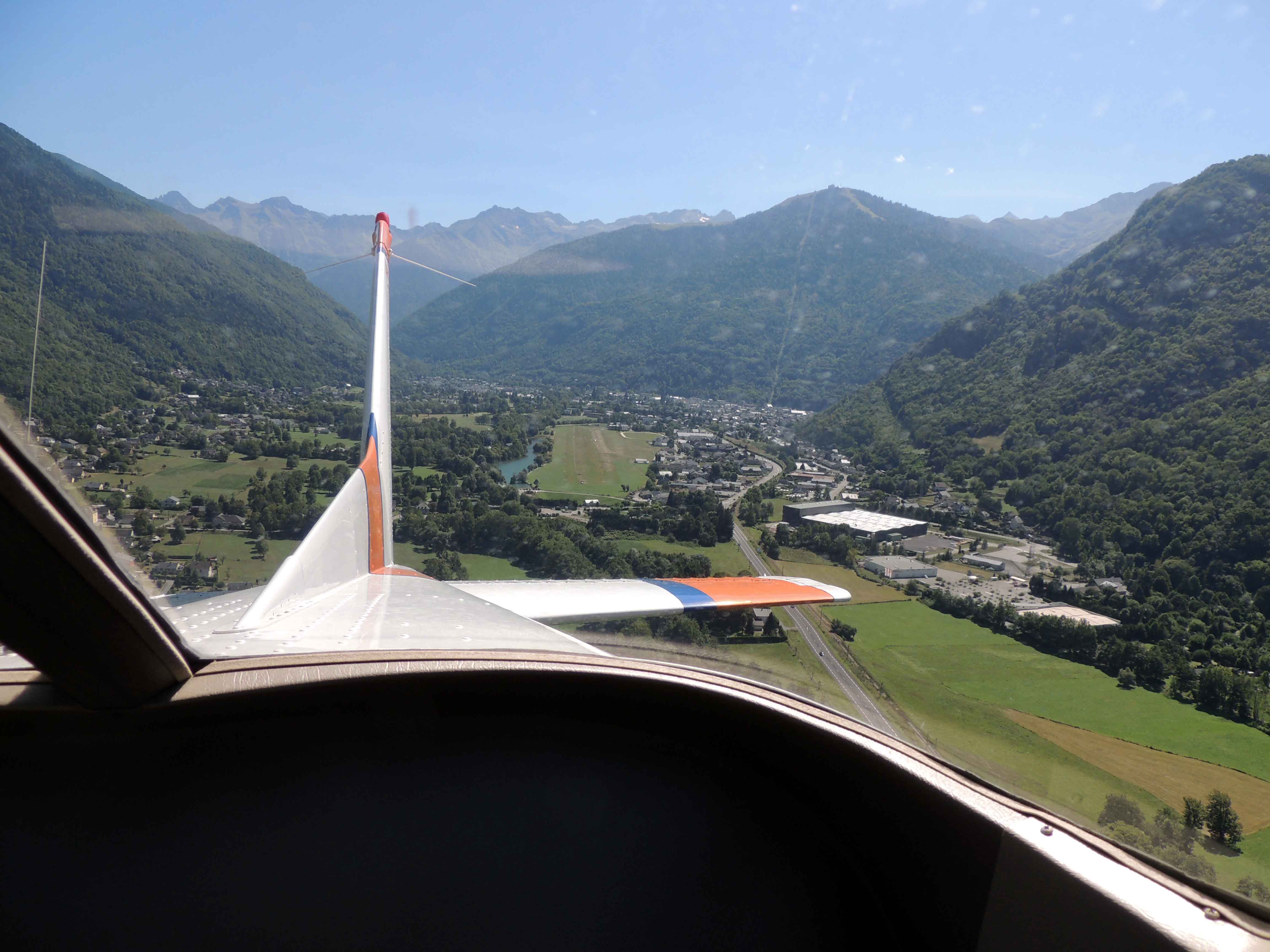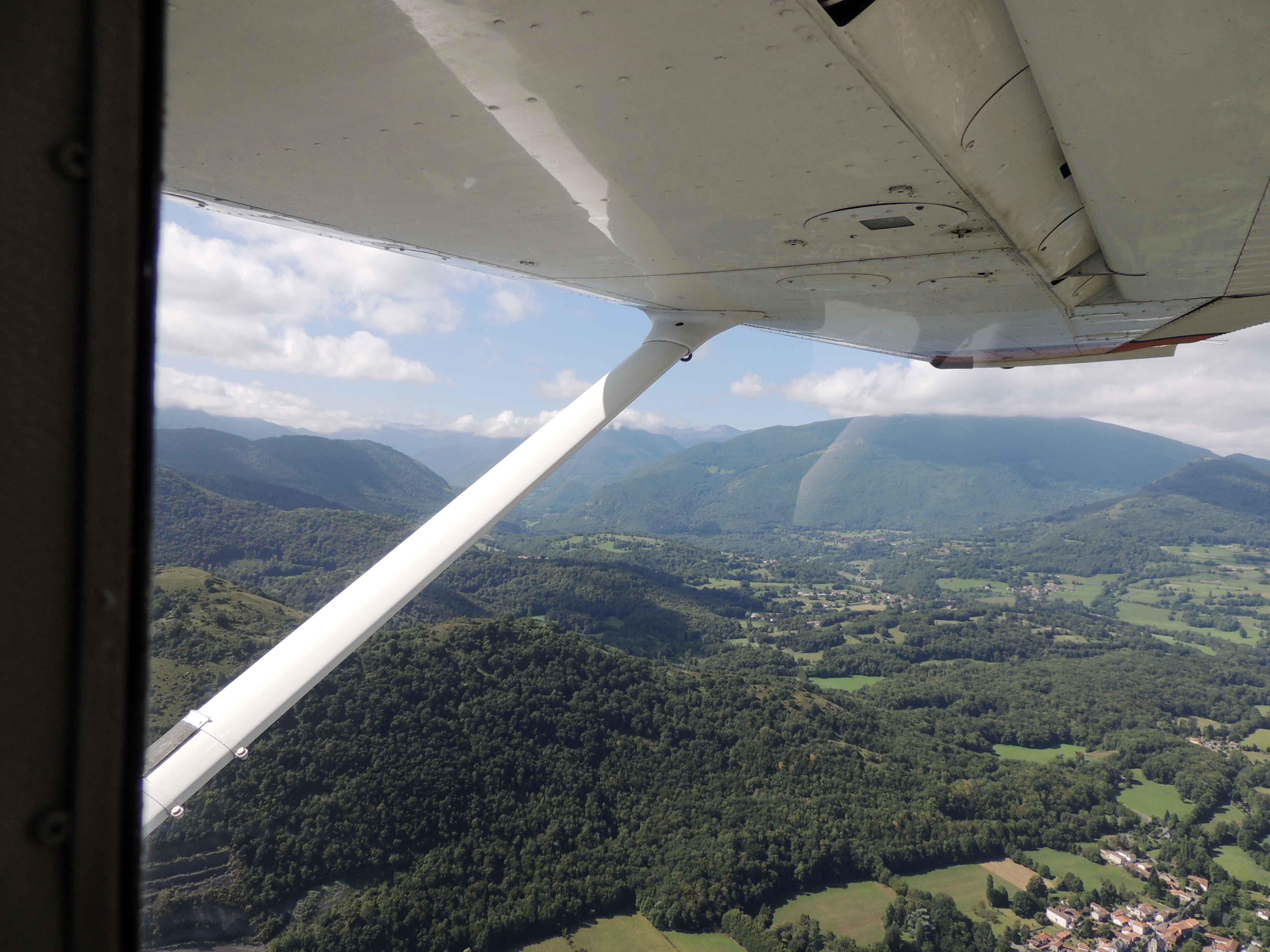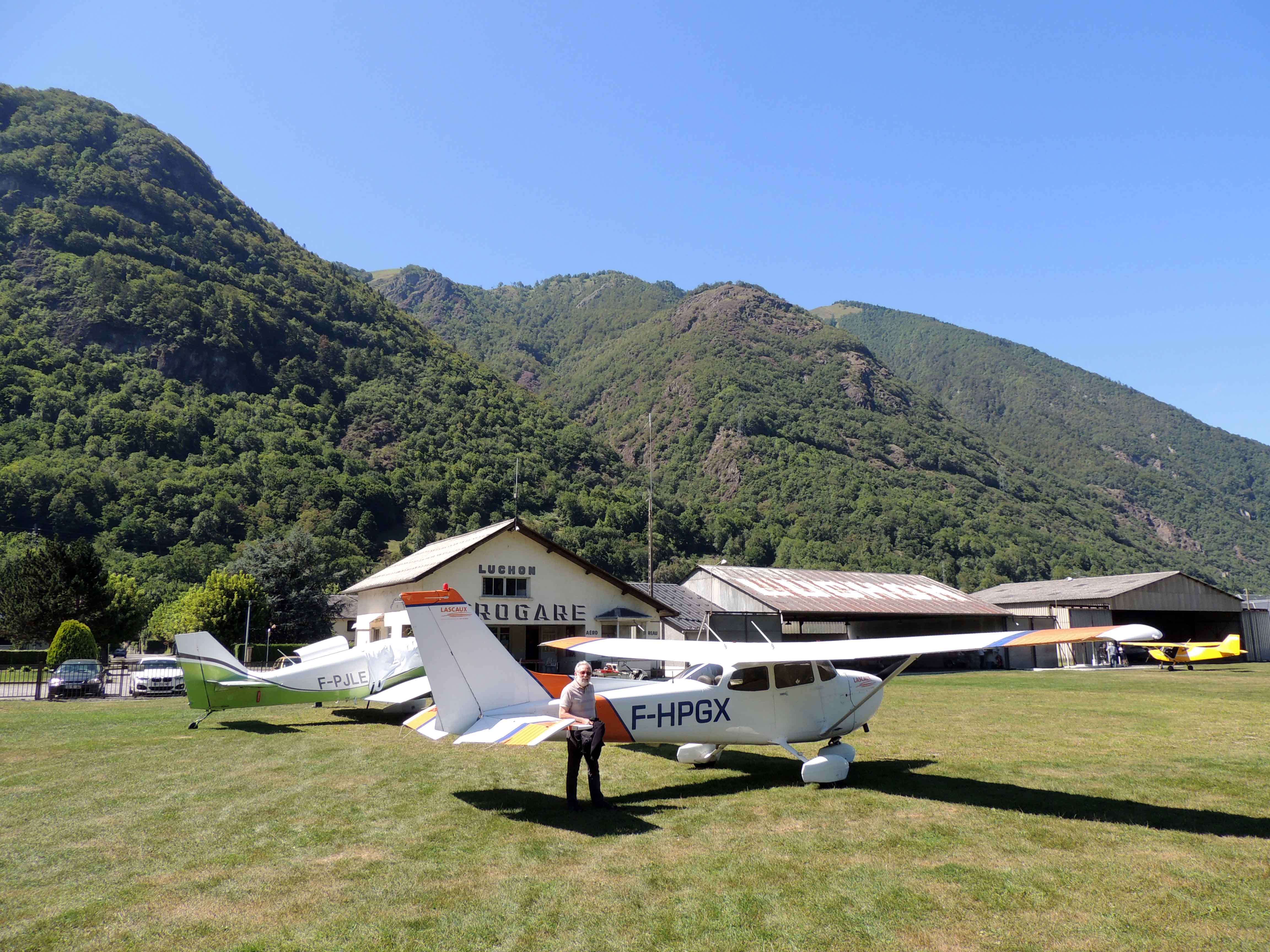 En ce dimanche 20 Août, c’était le temps idéal pour se rendre à Bagnères de Luchon depuis Périgueux. Valérie avait organisé les équipages, s’était renseigné sur la météo de la vallée et surtout retenu pour nous le restaurant. Tout était prêt pour la navigation, le briefing pour l’arrivée avec Jean-François notre instructeur, car le tour de piste n’est pas standard au creux de cette vallée encaissée et de plus la piste courte. Le Cessna 172 avait décollé le premier de Périgueux avec Guillaume aux commandes et Jean-François en place droite, suivi du Mousquetaire avec Jean-Louis et Patrice. Cap direct sur Saint Gaudens avant d’identifier la bonne vallée et de poursuivre sur la droite de la vallée en direction de CIERP, puis de LUCHON. Voici quelques photos de notre arrivée sur LUCHON et de notre retour vers Périgueux. Une navigation à faire et très formatrice sur le respect des procédures du vol en montagne et la maniabilité de l’avion.