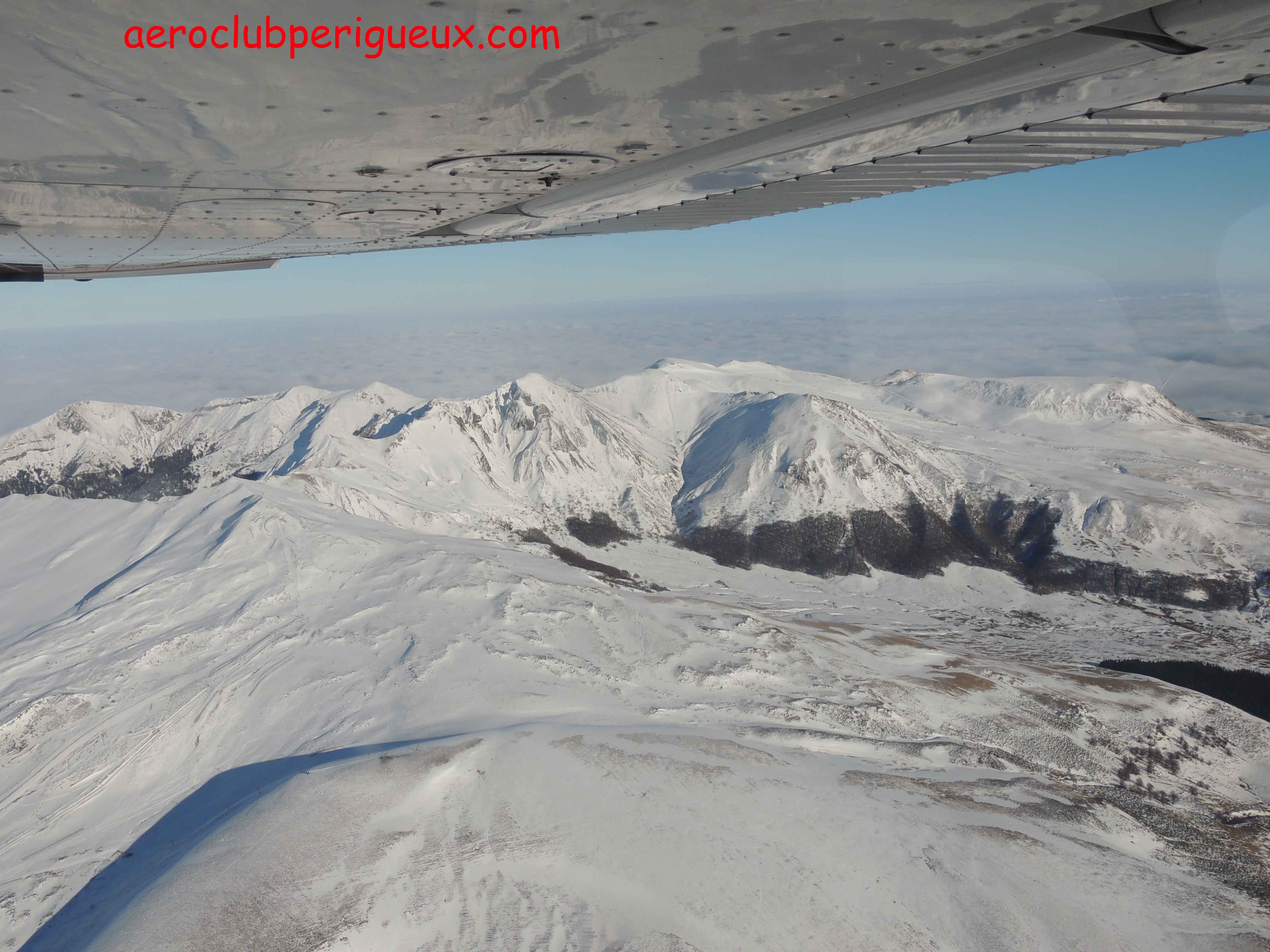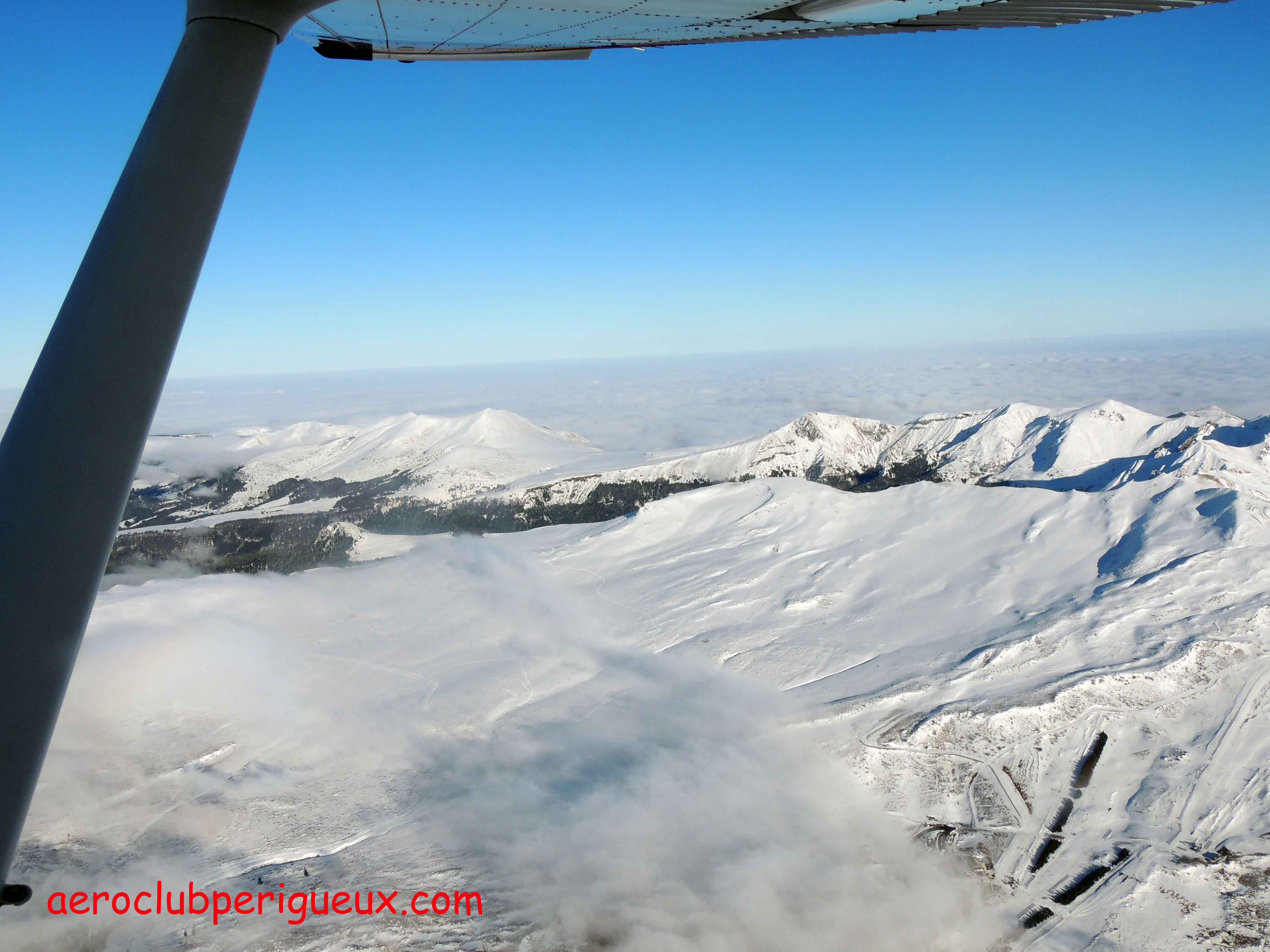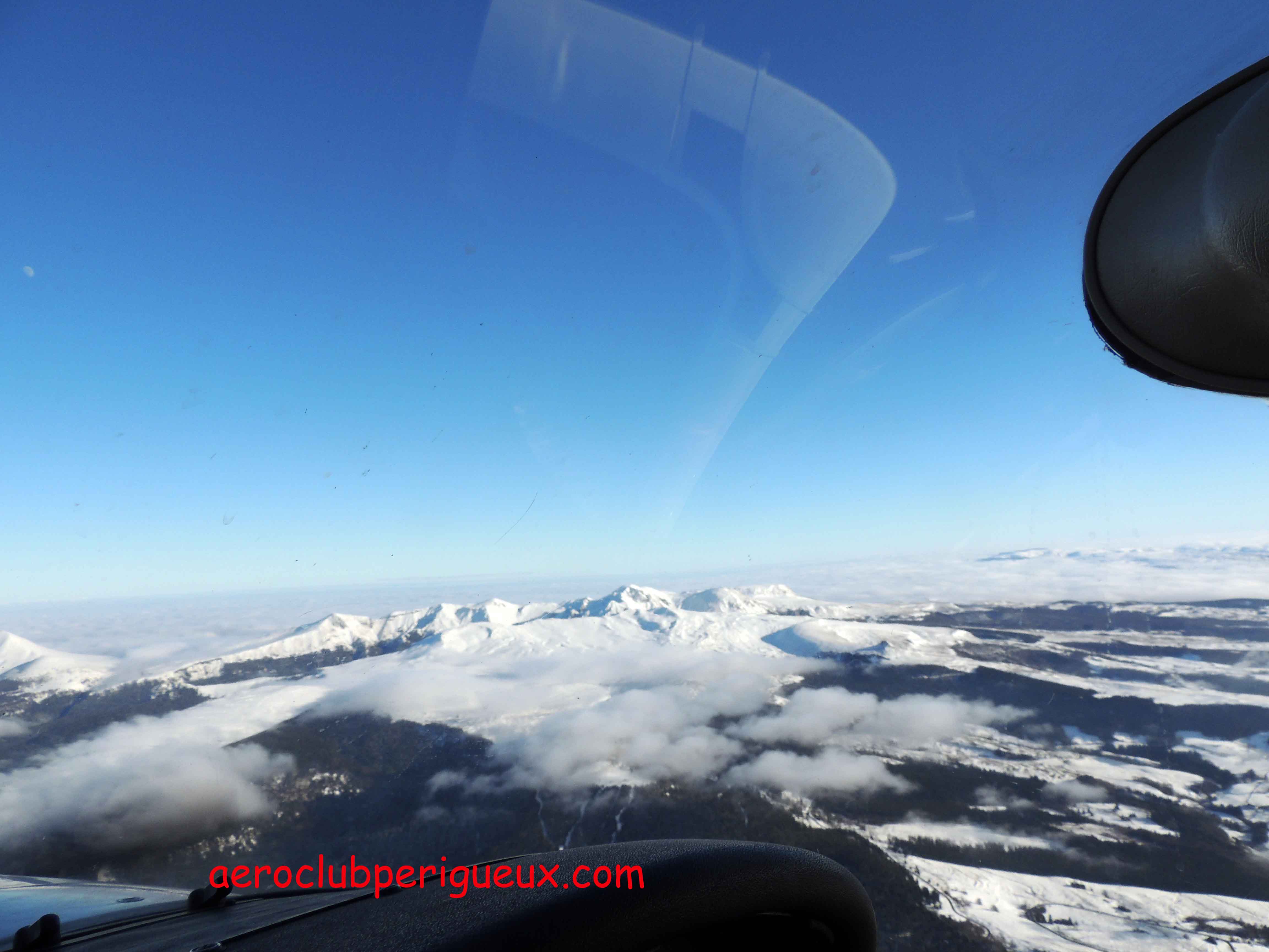 Après des conditions météorologiques désastreuses pour l’aéronautique de loisirs depuis début janvier, en ce samedi 27, le brouillard matinal de notre Périgord semblait vouloir se dissiper, laissant augurer un après-midi enfin favorable aux vols à vue. Un mail à tous les membres de l’aéroclub et nous nous retrouvons à quelques pilotes pour tenter une sortie vers le massif enneigé du Sancy. Un point Météo, une connexion sur les webcam du Sancy pour vérifier que ce dernier émerge des nuages, un peu d’essence dans les réservoirs et une visite prévol sérieuse et nous pouvons nous installer à bord de nos avions. 14h30 décollage, une montée au niveau 55, tout est parfait, la visibilité est bonne, nous sommes au dessus des nuages, avec déjà en ligne de mire le massif du Sancy. Activation du pilote automatique avec un GO TO sur Ussel LFCU et nous pouvons avec Hugo qui est élève pilote faire de la lecture de carte. Hautefort, Brive, l’A20, l’A89, les monts des monédières, Egletons, Meymac et enfin l’aérodrome d’Ussel qui est sous les nuages, mais peu importe, le but est de poursuivre jusqu’au Sancy qui se rapproche de plus en plus. Voir le Sancy enneigé, sous le soleil est un vrai régal pour Hugo, c’est toujours magnifique de pouvoir admirer ce massif du Sancy en cette saison et surtout avec autant de neige. Une grande boucle au niveau 65 autour de celui-ci, pour prendre quelques clichés et vérifier que la ville de Clermont-Ferrand était bien sous les nuages, comme noté lors du point Météo, qu’il faut déjà penser au vol retour sur Périgueux (LFBX). Voici quelques photos aériennes de ce vol.