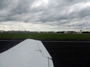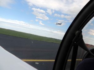 Après un heure de vol Châteauroux est en vue, piste en service 21, mais au vu du faible vent au sol, le contrôleur aérien propose à tous les avions arrivant de Périgueux une longue finale pour la 03. même avec un léger vent arrière, 3 km de piste est largement suffisant pour poser nos petits avions, en comparaison aux avions commerciaux qui fréquentent régulièrement cette plateforme.