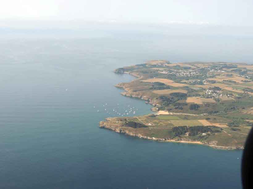 Après plusieurs semaines de préparation, nous décollons de Périgueux vers 08h30 le samedi 18 août pour atteindre Belle-île en milieu de matinée. Je serai commandant de bord pour ce vol et nous montons à 6500 pieds dans un air calme et peu de trafic sur notre route. A cette altitude nous apercevons les grands repères du parcours de loin et Tanguy photographie de splendides panoramas.