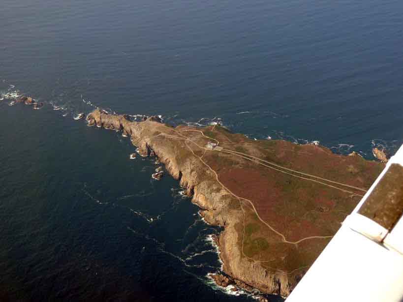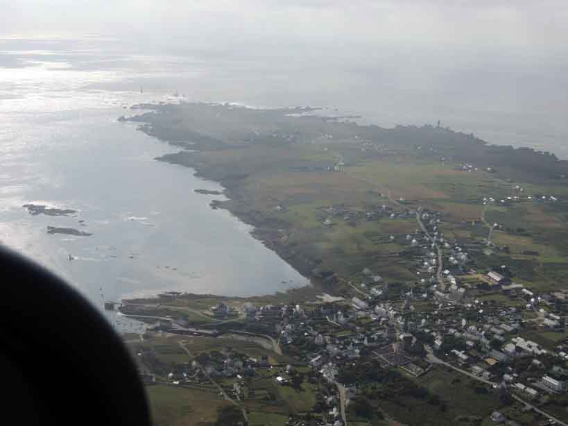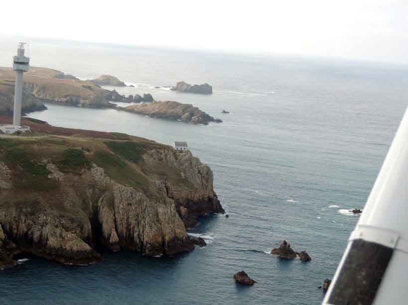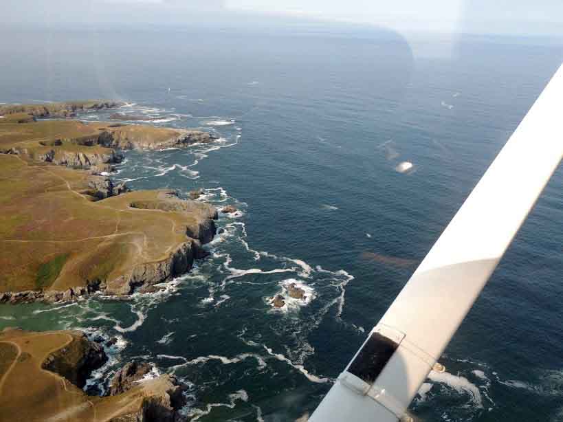 Vers 10h30, atterrissage à Belle-île. L’accueil des usagers de l’aéroclub et du personnel du terrain est très chaleureux et 2 vélos loués à l’avance nous attendent sur le parking. Après un rapide passage par Bangor, nous mangeons sur les quais à « Le Palais » pour finir par le Port Coton et ses falaises majestueuses en début d’après-midi. Après avoir pris les derniers messages météo de Brest et Lorient, nous décidons de partir pour Ouessant vers 16h30. Direction Quiberon pour le premier point tournant puis nous survolons l’île de Groix en finissant par la pointe du Raz. Le transit maritime vers Ouessant est alors entamé et nous redoutons l’arrivée sur l’île connaissant les caprices de la météo bretonne. Nous sommes alors très surpris d’avoir l’île en visuel depuis nos 4500 pieds dégagée de nuages et semblant attendre notre arrivée. La plateforme, grâce à son bitume de couleur blanche due au sel marin, est visible de loin. L’approche au-dessus des vagues est spectaculaire et nous nous posons sans encombre très fiers d’avoir atteint notre destination finale.