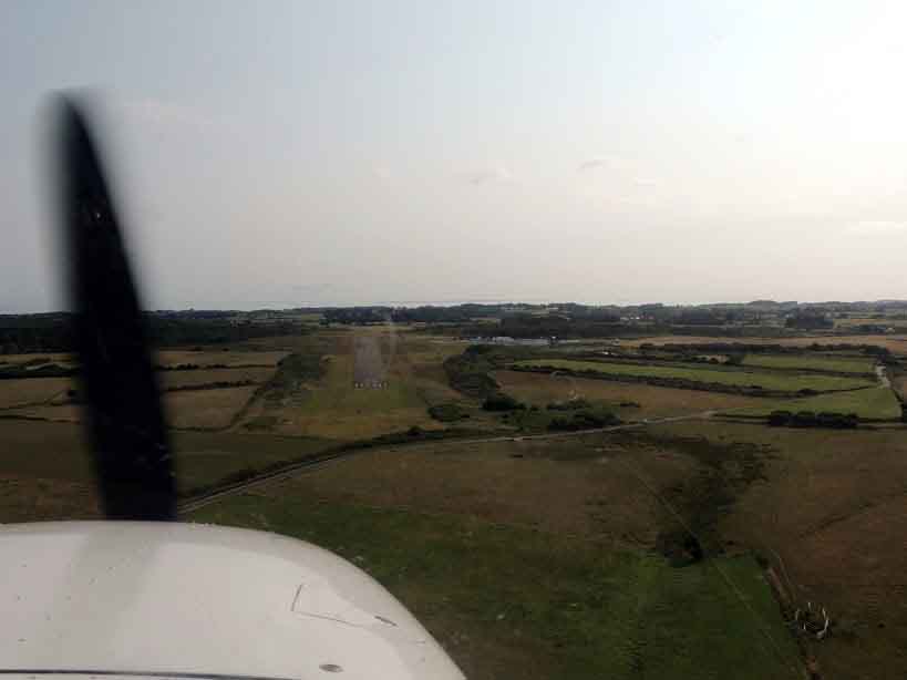 Notre désillusion est grande devant le brouillard dense qui recouvre l’île le lundi matin. Nous attendrons toute la matinée dans l’aérogare de la finistair en compagnie de l’agent AFIS (aussi jardinier, pompier, agent de piste …) qui nous tiendra gentiment compagnie jusqu’au départ. Puis, d’un coup, en 10min, le brouillard se dissipe et laisse place à des éclaircies et de franches trouées dans le ciel. C’est le moment de partir et de quitter cette magnifique île bretonne. Je m’installe aux commandes et après 5 min de chauffe, nous voilà en l’air. Nous passons au-dessus de quelques petits nuages et nous nous retrouvons au-dessus de la couche au niveau 75 avec une super visibilité, alors que, comme nous le signale la contrôleuse, les conditions météo à Brest sont minables. Nous avions prévu au départ de faire le plein à Lannion, ce qui va s’avérer totalement impossible car nous ne pouvons pas passer en dessous de la couche. Ce n’est pas grave, les réservoirs sont encore bien remplis donc nous partons en direction de Vannes. En approchant de ce terrain, nous avons de la chance, nous pouvons passer en dessous de la couche et nous poser sans problème.