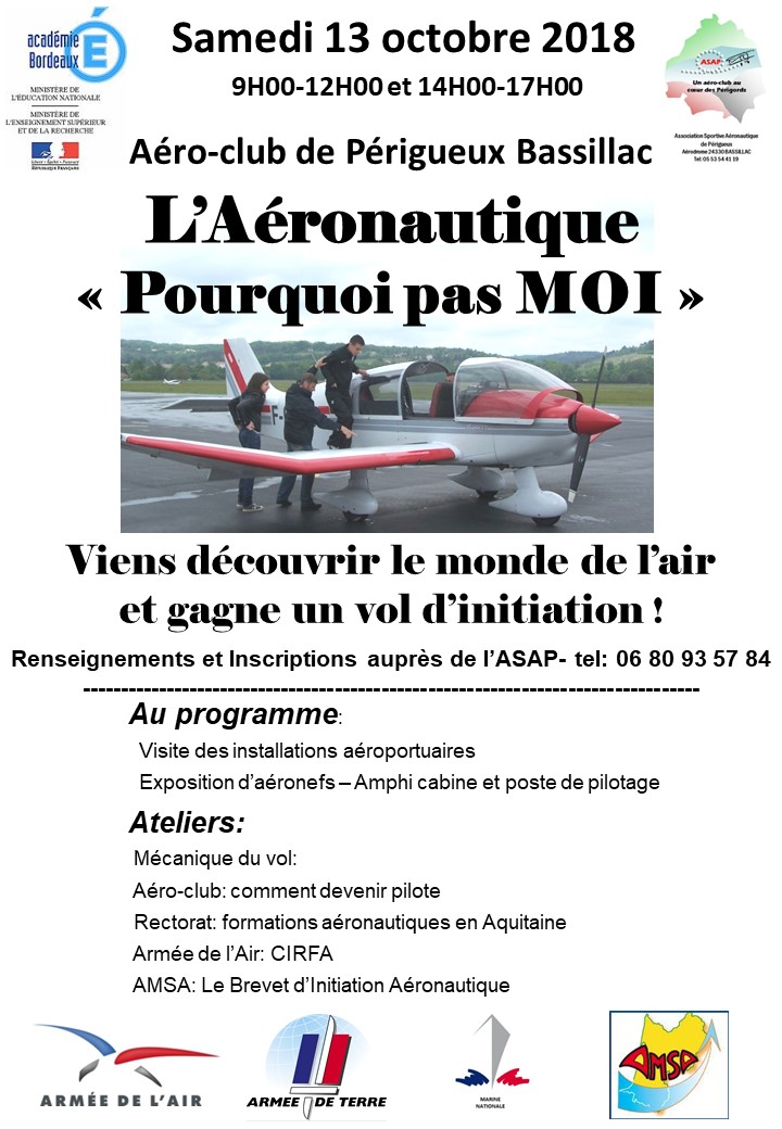 A l’aéroclub de Périgueux-Bassillac, le samedi 13 octobre sera consacré à la découverte des métiers et activités aéronautiques. Cette journée est ouverte à tous les jeunes de plus de 14ans, qu’ils soient collégiens et lycéens et qui sont veulent découvrir les possibilités de carrière offertes par le pilotage, la construction et la maintenance des avions.
