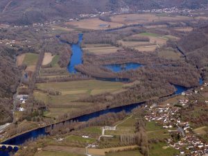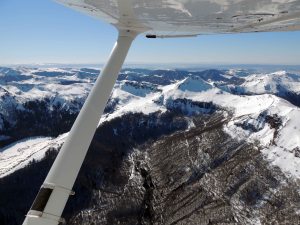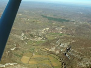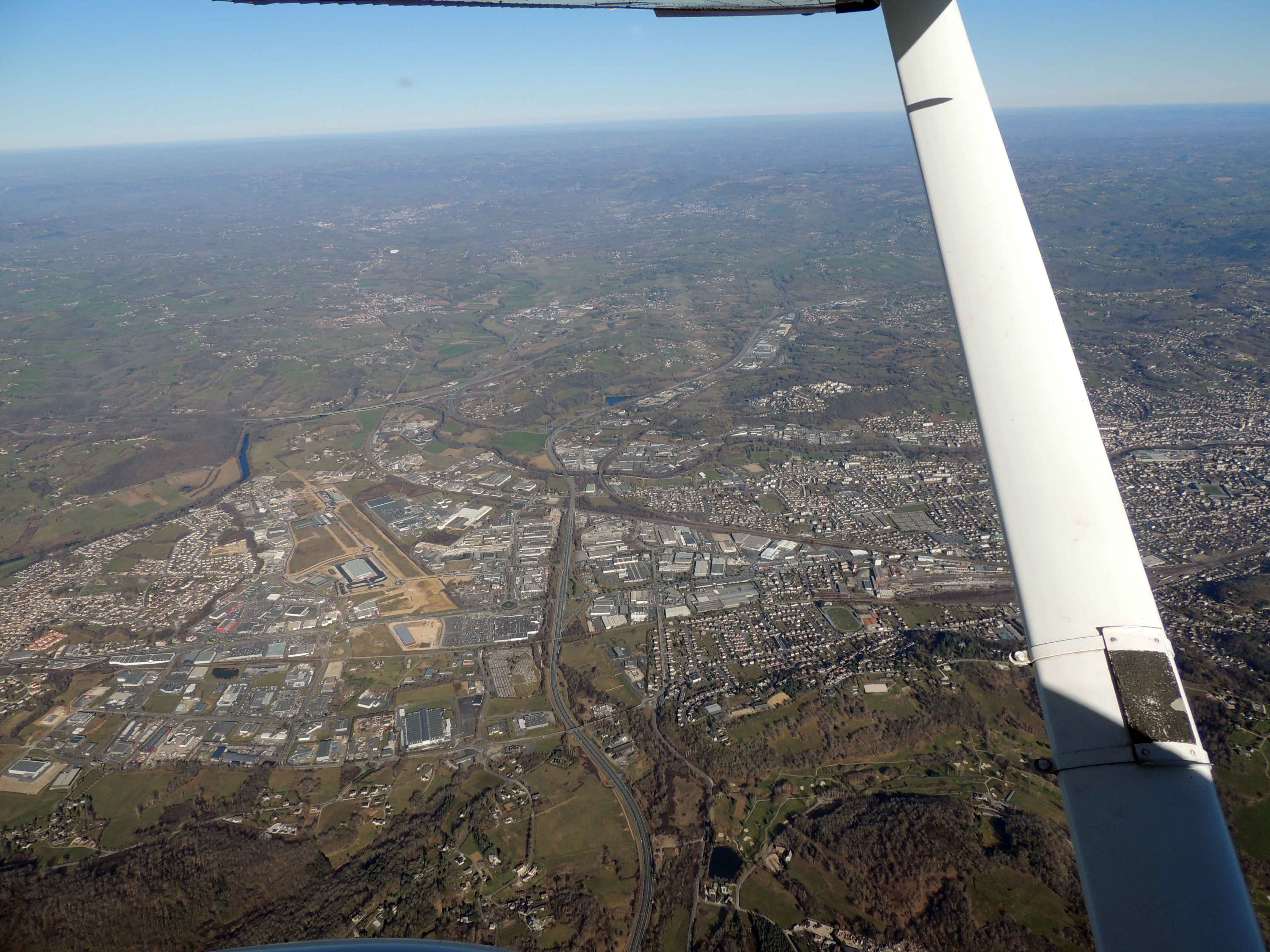 Il y avait embouteillage au point d’attente Alfa sur l‘aérodrome de Périgueux-Bassillac en ce samedi 23 février. Il est exceptionnel en cette saison d’avoir de telles conditions météorologiques et tous les avions de Périgueux et d’ailleurs en vol ou en partance pour des navigations sur tout le Sud-Ouest. Pour nous à bord du Cessna 172, c’est: destination le massif du Cantal pour voir s’il reste encore de la neige et Villefranche de Rouergue pour la halte gastronomique. Après avoir atteint le niveau 55, on ne risquait pas se perdre, les montagnes étaient en vue depuis la Dordogne. Le GPS et le pilote automatique (PA), c’était du superflue, mais le PA permet de maintenir l’altitude et le cap, permettant ainsi au pilote de profiter du paysage et d’une bonne dose de soleil. Un petit vent d’EST nous limite à 107 noeuds de vitesse sol, rien de grave sur le trajet retour, il nous sera favorable, compensant ainsi le temps de vol supplémentaire pour l’aller. Survol de Brive et de son ancien aérodrome transformé en zone d’activité, des gorges de la Dordogne avec le barrage du Chastang au nord d’Argentat, avant de contourner le massif du Cantal par le Nord. Le Puy Mary, le domaine skiable du Plomb de Cantal, puis Cap au 220 pour rejoindre Villefranche de Rouergue avec une pause convivialité au restaurant le Saint Exupéry et le régime « fruit » de René. Sur le retour à Périgueux, croisement de la vallée du Lot, du Célé taillées dans le calcaire du causse et de nouveau la rivière Dordogne avec une vallée laissant de larges espaces à l’agriculture et aux diverses activités touristiques.