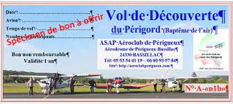 Comment se déroule un baptême de l’air ? Le baptême de l’air ou le vol de découverte se déroule à bord des avions de l’aéroclub qui peuvent transporter de 1 à 3 passagers. Les circuits proposés vont de l’agglomération Périgourdine à Brantome ou Hautefort par exemple. Ces vols se font toute l’année quand les conditions météorologiques sont optimales, (Absences de brouillard, de pluie, de vent fort par exemple)