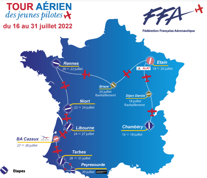 Voici ci-à-coté les différents étapes du TAJP2022. Le grand Sud-ouest accueille les jeunes pilotes du 22 au 31 juillet. C’est une opération qui sera médiatisée au plan local, mais également sur chaque ville étape.