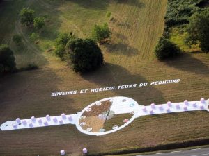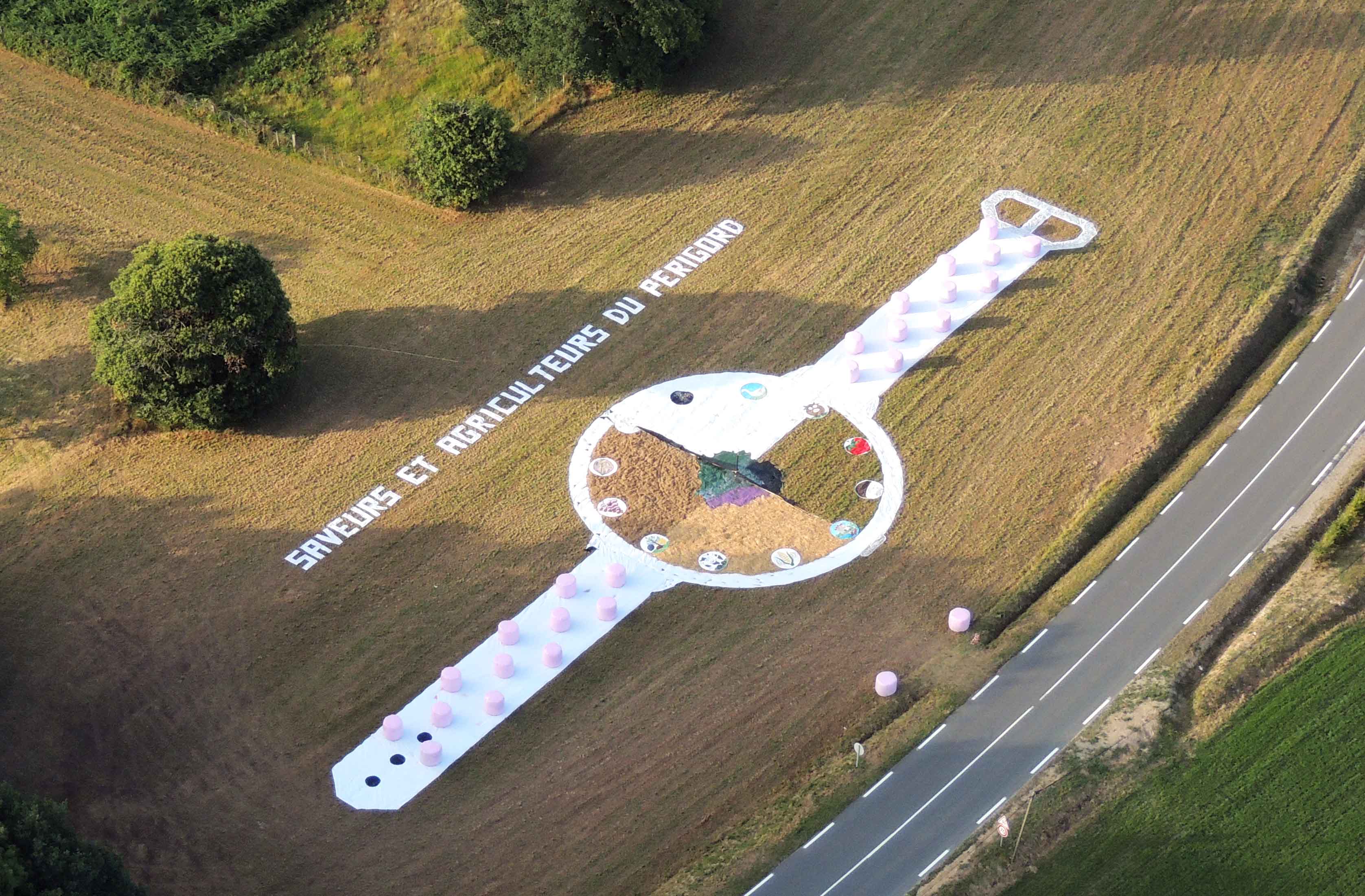 En croisant le parcours de l’étape Périgueux-Bergerac du Tour de France cycliste, voici une oeuvre originale réalisée à proximité de Thenon par les agriculteurs du Périgord. Cette montre est vraiment magnifique et a du représenter un gros travail de conception. Félicitations à nos agriculteurs de Dordogne qui proposent des produits de qualité.